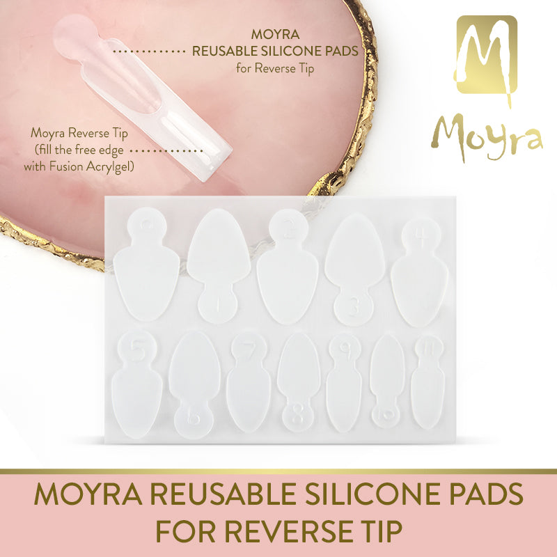 Fill the free edge with Fusion Acrylgel, then remove the silicone pad. Fill the nail bed part with another colour of Fusion Acrylgel. Place the tip on the nail, cure it, then remove the Reverse tip. The silicone pad can be cleaned and reused.